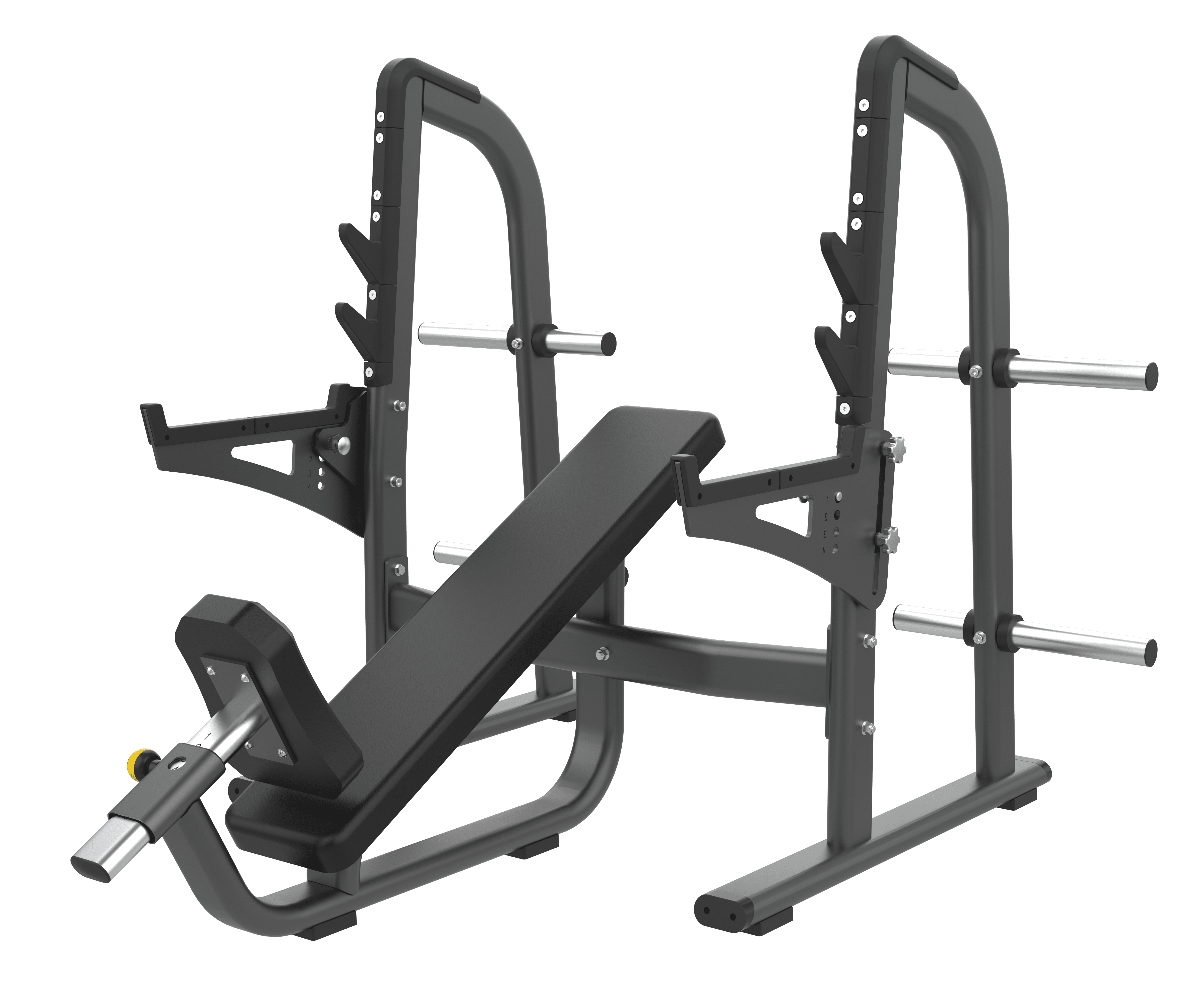 O ângulo de inclinação fixo garante um direcionamento consistente da parte superior do tórax, enquanto o sistema de rack completo fornece a segurança necessária para sobrecarga progressiva.