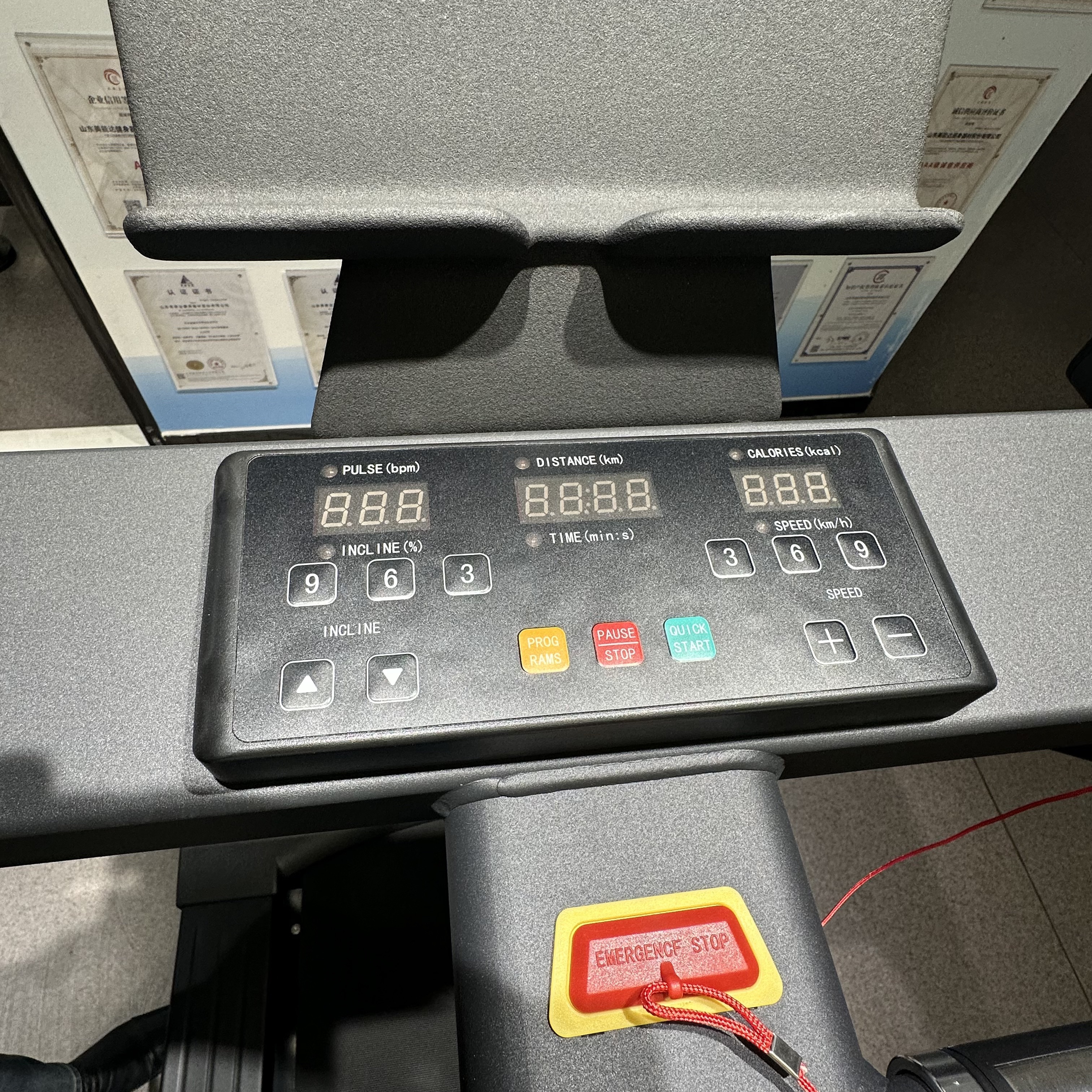 Console: display LED para velocidade, inclinação, calorias, frequência cardíaca, tempo, programa, distância