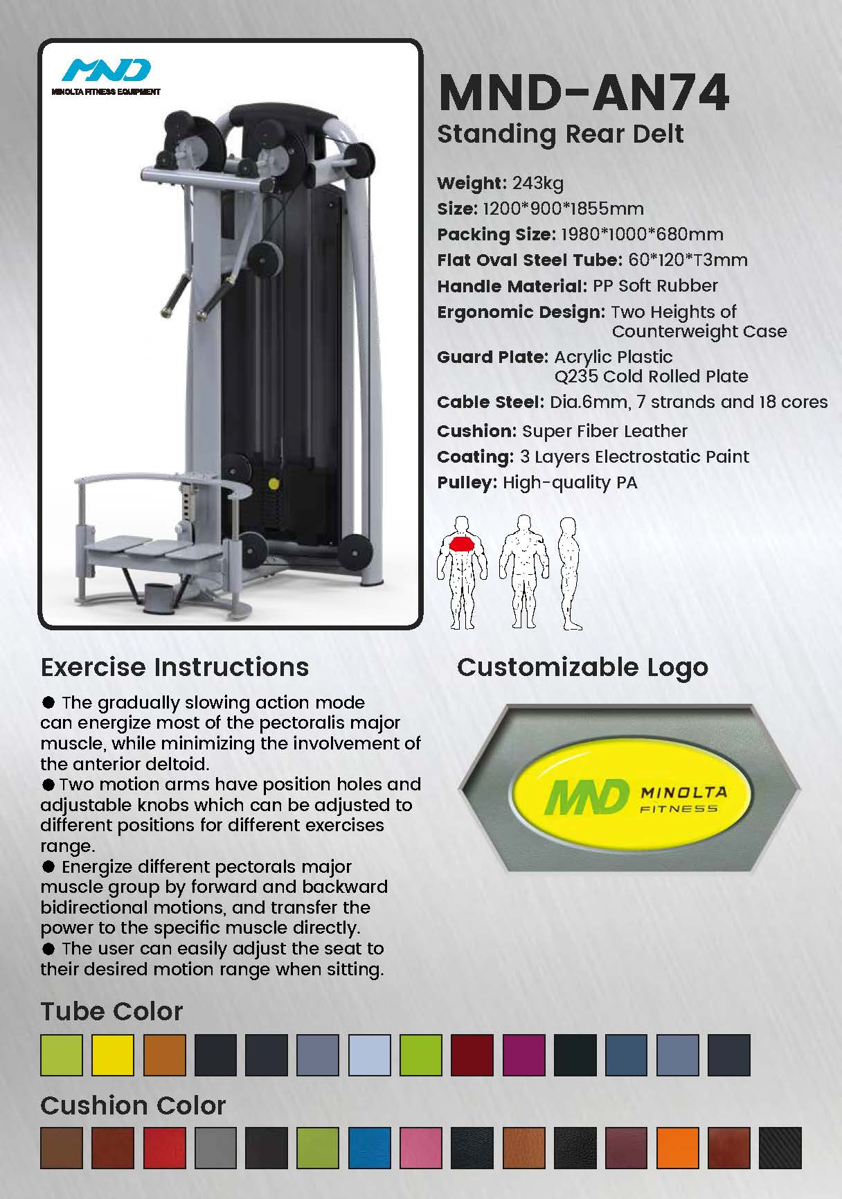 O AN74 apresenta uma posição de pé especializada que permite o movimento escapular natural durante o treinamento do deltóide posterior. A almofada torácica ajustável e o sistema de articulação de precisão trabalham juntos para proporcionar um desenvolvimento posterior direcionado dos ombros.