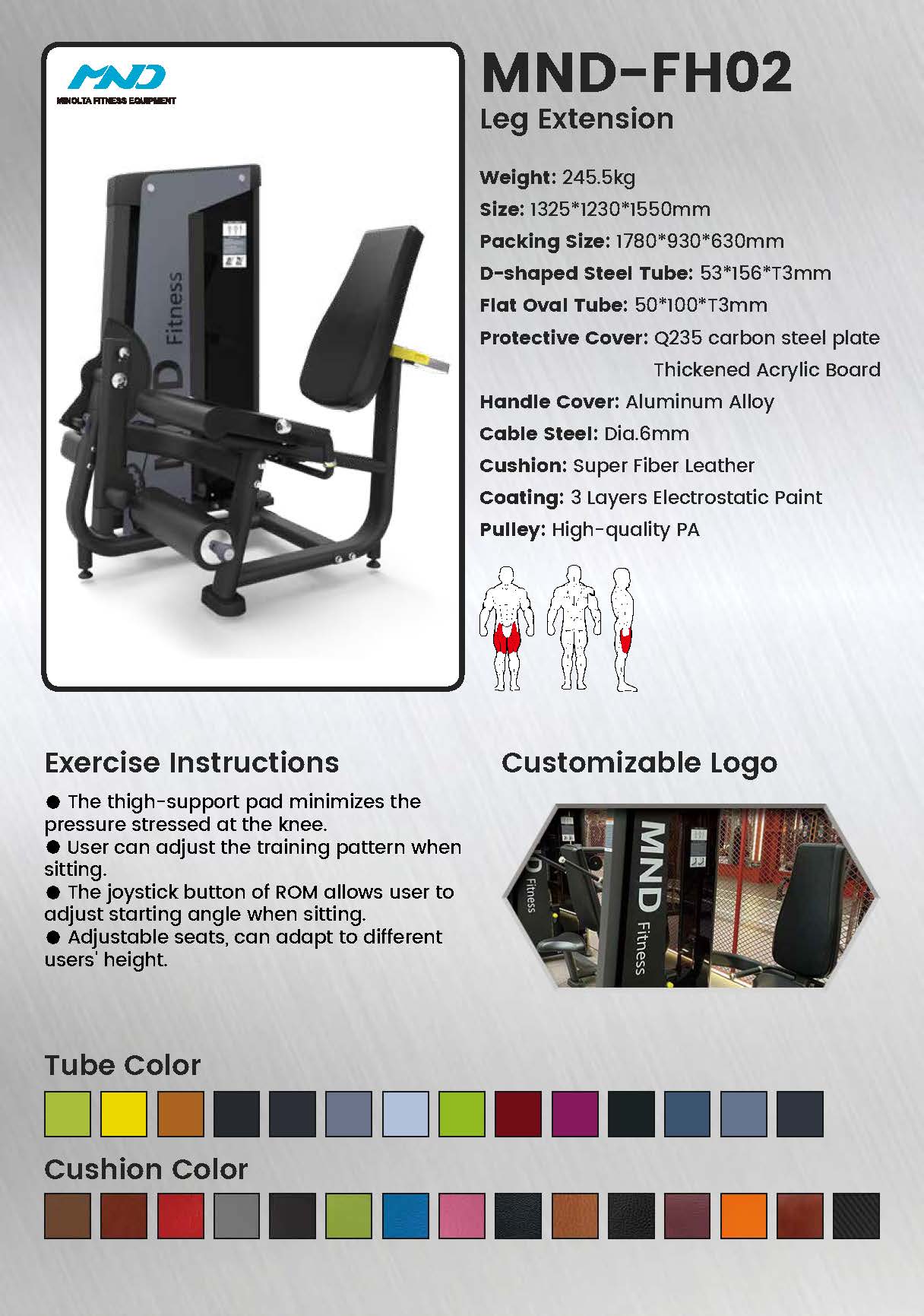 A extensão de perna MND FH02 oferece resistência direcionada diretamente ao quadríceps, um movimento fundamental tanto para o desempenho atlético quanto para o desenvolvimento estético. Seu caminho de movimento ergonômico garante que a articulação do joelho seja apoiada enquanto os músculos estão totalmente engajados, inseridos em uma estrutura de aço resistente construída para uso comercial.