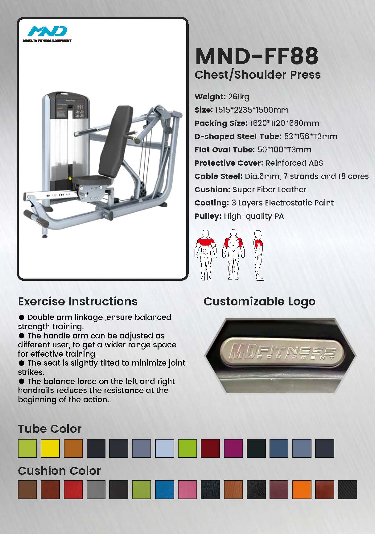 O MND-FP88 foi projetado para treinamento de força sério. A sua construção robusta e trajetória de movimento precisa garantem treinos eficazes e seguros para aumentar a massa do peito e dos ombros, tornando-o uma pedra angular de qualquer zona de treino da parte superior do corpo.