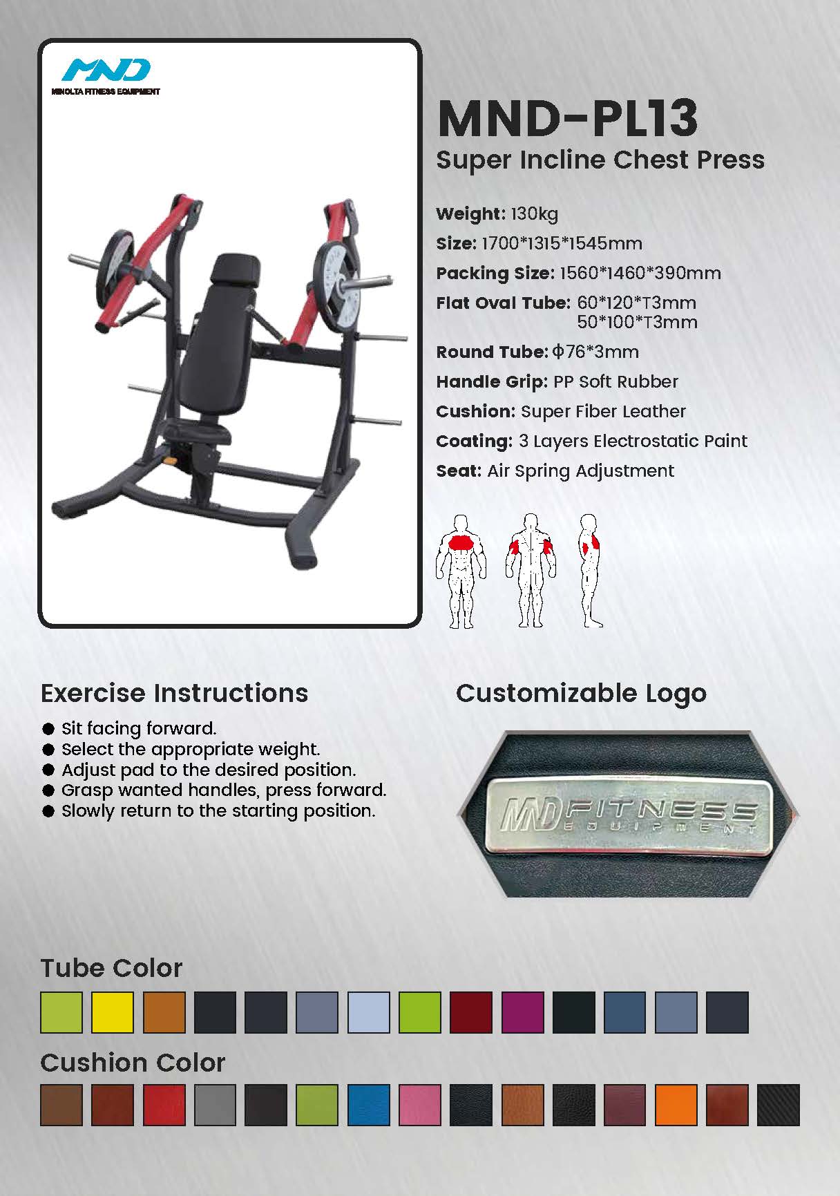 A maioria das prensas inclinadas não são íngremes o suficiente para isolar totalmente a parte superior do tórax. O MND-PL13 resolve isso com seu caminho de movimento exclusivo que visa especificamente a área entre o ombro e a parte superior do tórax - a chave para alcançar aquela aparência completa e blindada.